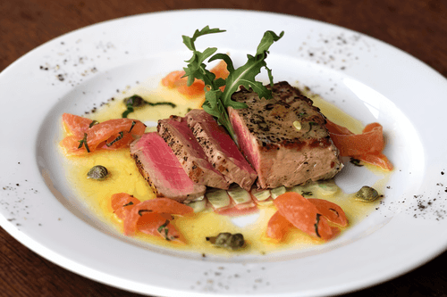 Стейк из тунца — это истинное наслаждение для гурманов, сочетающее свежесть моря с утонченным вкусом. Этот рецепт пришел из европейской кухни, где простота и натуральность продуктов ценятся превыше всего. Кусок свежего тунца, слегка приправленный солью и черным перцем, обжаривается на гриле, оставляя внутри нежную сыроватую текстуру. Гармонию вкуса дополняет изысканный соус из сливочного масла, лимонного сока, каперсов и тонко нарезанных томатов, придающий блюду кисло-сладкие нотки. Легкость и свежесть обеспечивает гарнир из огуречных лент и рукколы. Этот стейк идеально сочетается с белым вином и является прекрасным выбором для легкого ужина или изысканного угощения для гостей.