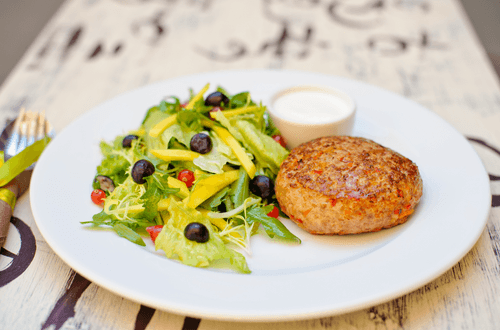 Топингом к блюду служит фермерская сметана, которую мы подаем вместе с бургером и салатом.