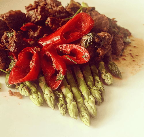 Глубокую сковороду поставьте на средний огонь. Добавьте масло, имбирь и чеснок. Когда почувствуете запах чеснока, выложите мясо. Жарьте в течение нескольких минут, до готовности мяса. Добавьте перец чили, спаржу. Немного потушите. Добавьте соевый соус и немного белого вина. Тушите еще несколько минут. Снимите с огня и подавайте с рисом.