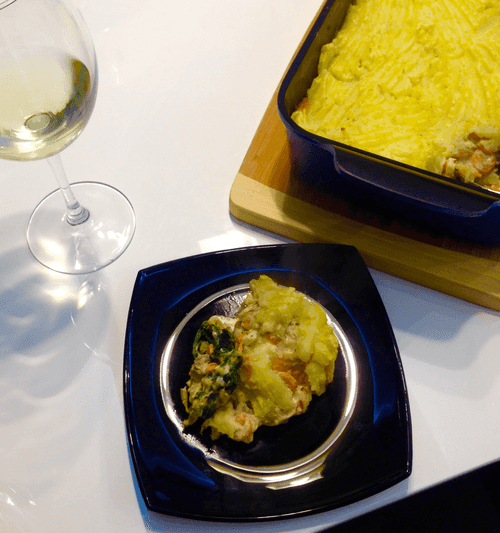 Форму для запекания смазать, уложить в нее треску, небольшими кусочками нарезанную пикшу (заменяли любой красной рыбой — выходит очень хорошо), яйца, поделенные на четвертинки, шпинат (все разбросать в художественном беспорядке),залить с обжаренными овощами, засыпать мятой картошкой (специально не разравниваем, так выглядит интереснее), сбрызнуть оливковым маслом.