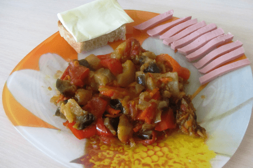 Овощи нарезаем кубиками. В кастрюлю или казан наливаем душистое растительное масло, кидаем туда порезанные кубиками кабачки, накрываем крышкой.Через минут 7–10 кладем баклажаны.
