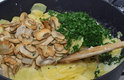 Мелко нарезаем петрушку. Снимаем сковороду с картошкой с огня и проверяем специи на вкус. Вмешиваем в блюдо грибы и петрушку.