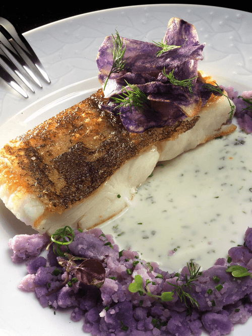 Палтус с фиолетовым картофелем и соусом из йогурта