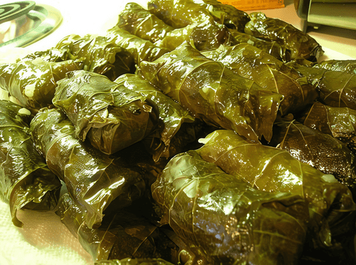 Завернуть начинку в виноградные листья, начиная со стебельной части листа. Посолить, уложить в кастрюлю плотными рядами и тушить на слабом огне около часа, накрыв крышкой.