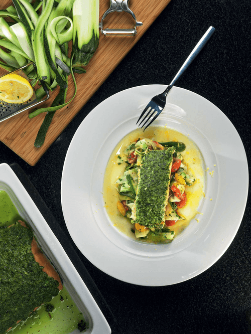 Лосось под корочкой из песто, с лапшой из цукини