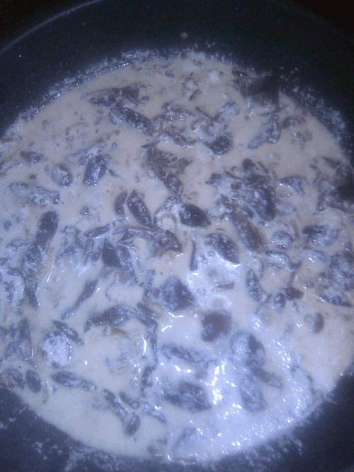 Как только наши грибы готовы, добавить к ним сметану, немного разбавив ее водой, чтоб не было сильно густо.