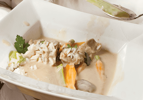 Телятина в сливочном соусе — изысканное блюдо европейской кухни, вобравшее в себя традиции гастрономии старого света. Нежное мясо, медленно проваренное с овощами, наполняется глубоким вкусом бульона, а затем окутывается бархатным сливочным соусом. Этот рецепт напоминает классические французские рагу, где каждая деталь сбалансирована, а текстуры сочетаются в гармонии. Кремовая консистенция соуса прекрасно подчеркивает деликатность телятины, дополняя ее легкой пикантностью черного и кайенского перца. Подается с рассыпчатым рисом, создавая идеальный дуэт вкуса и насыщенности. Это блюдо достойно праздничного ужина, но его уютные нотки также делают его отличным вариантом для семейного застолья. Украшенное свежей петрушкой и сметаной, оно становится настоящим воплощением комфорта и кулинарного мастерства.