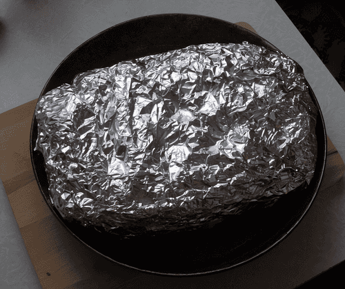 Теперь заворачиваем мясо в фольгу (5–7 слоев). Важно следить, чтобы не было надрывов и сквозных дырочек, иначе сок будет вытекать и мясо получится сухим.