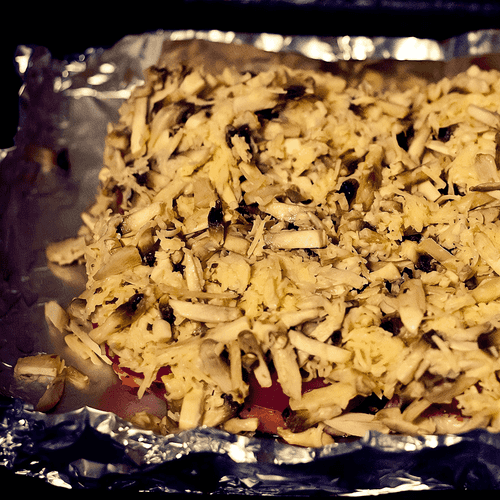 На терке трем сыр и сырые шампиньоны (если терка мелкая, можно порезать тонкими полосками). Перемешиваем их. Можно добавить чуть-чуть майонеза для связности. Кто не любит майонез — можно обойтись без него — все равно все расплавится.