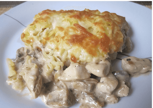 Курица с грибами, запеченная под картофельно-сырной шубой