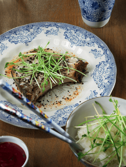 В соусе, оставшемся в сковороде, в течение минуты обжаривать нарубленную толстой соломкой пекинскую капусту, после чего приправить ее рубленой кинзой, шпинатом и лимонным соком.