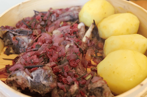 Репчатый лук режем кубиком среднего размера. Укроп, петрушку и розмарин шинкуем не слишком мелко. Добавляем черный молотый перец, соль, зиру, мелко натертый чеснок, бруснику. Переминаем все руками, чтобы брусника вся полопалась.