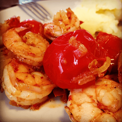 Тигровые креветки с помидорами черри и обжаренным луком (палео)