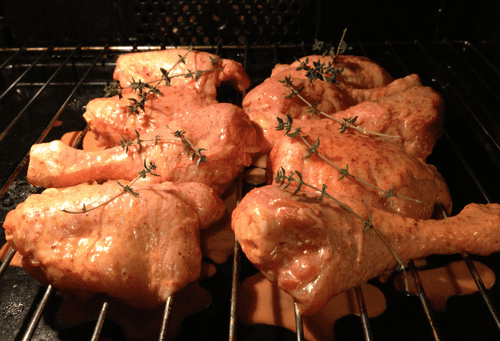 Пока духовка разогревается, мы стелем на противень фольгу (туда будет капать жир и сок с мяса, и после приготовления проще просто выбросить использованную фольгу, нежели отмывать противень). Замаринованные ножки выкладываем на решетку и помещаем над противнем. Сверху на кусочки мяса можно положить веточки тимьяна для аромата (по желанию).