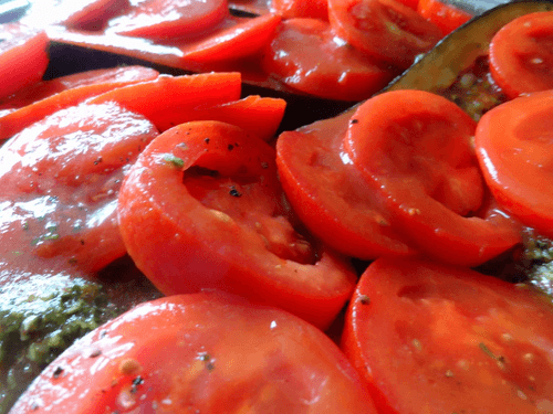 На картофель — сливы, баклажаны, фаршированные зеленью, чесноком, орехами, топленым маслом, посолить и поперчить. Затем выложить помидоры, посолить и поперчить. Тыкву и залить томатным соком.
