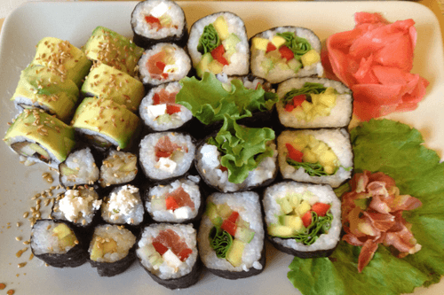Если у ролла из начинки только авокадо (т.е. ролл маленький), то квадратный лист водорослей нужно разрезать на два равных прямоугольника. Если начинки много (как у овощного), тогда берем целый лист, либо отрезаем от целого полтора–два деления (на листе есть разметки).