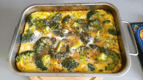 Яйца немного взбить, залить смесью брокколи.
