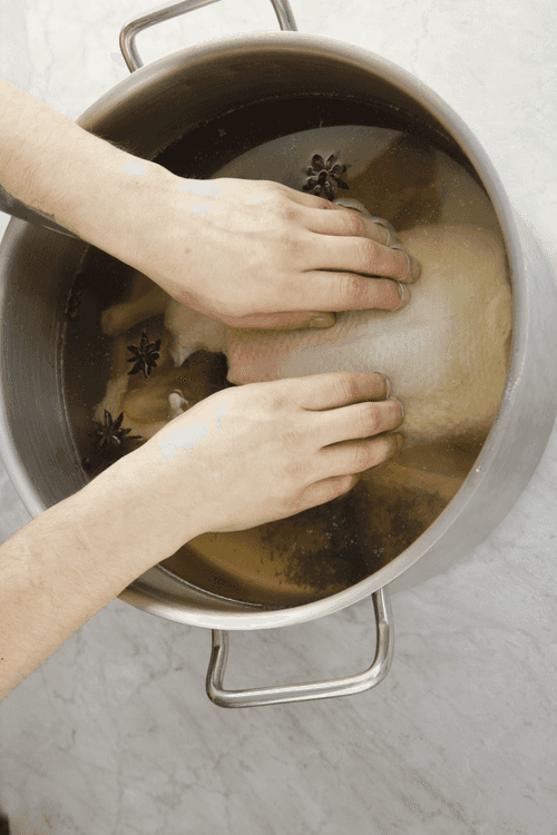 Поместить утку в рассол. Поставить в холодильник на шесть-восемь часов. Достать утку из холодильника, просушить бумажными полотенцами и отправить на полтора часа в разогретую до 90 градусов духовку. Потом увеличить жар до 200 градусов и запекать утку до готовности еще полчаса.