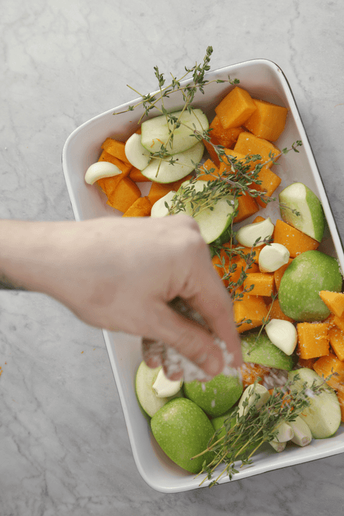 Нарезать тыкву кусками размером 5–6 см, яблоки нарезать на четвертинки, удалив сердцевину. Высыпать на противень, полить растительным маслом и бальзамическим кремом, положить веточки тимьяна, посолить, поперчить и поставить в духовку, когда та разогреется до 200 градусов.