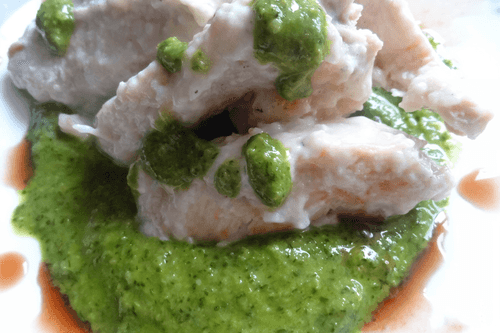 Куриные грудки в сливочно-лимонном креме на подушке из соуса песто