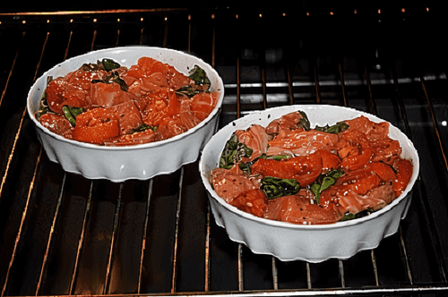 Выложить рыбу с томатами и базиликом в огнеупорные формы.