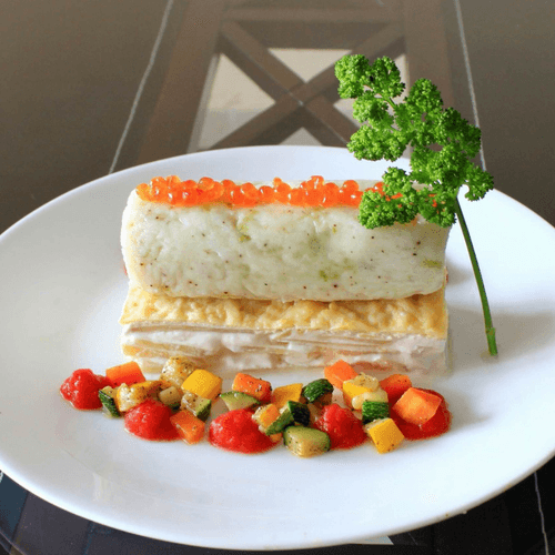 Рыбный мусс с гратеном дофине, овощами и томатным кули