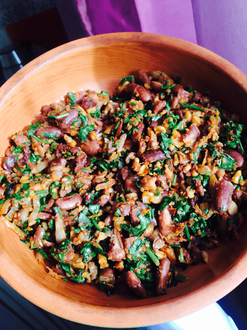 Жарим 15 минут, помешивая и разминая бобы фасоли так, чтобы половина раздавилась.
