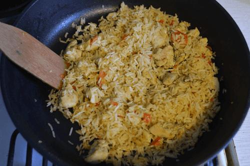 Тем временем, отварить до готовности промытый рис (посолить рис). Добавить его к курице и обжарить еще 5 минут.