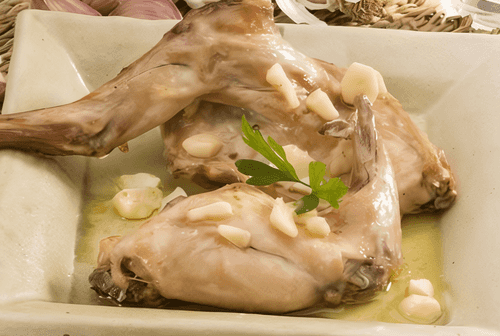 Для приготовления абсолютно любого блюда из кролика, мясо следует выдерживать в маринаде. Для этого удаляем с тушки верхнюю белую пленку, кладем в кастрюлю с холодной водой, выжимаем туда сок половины лимона, добавляем 0,5 чайные ложки уксуса и веточку розмарина. Маринуем всю тушку целиком в течение нескольких часов.