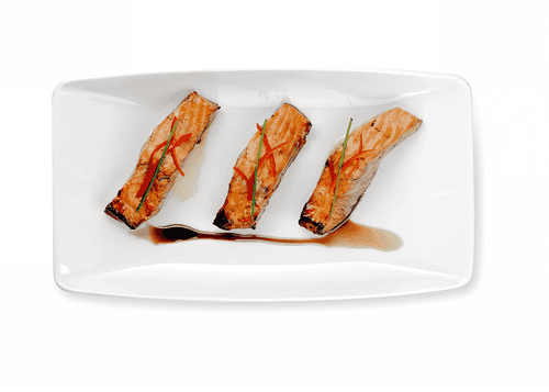 Разогреть духовку до 180 градусов, выстлать противень пекарской бумагой, на нее выложить промаринованные ломтики лосося. Поставить противень с лососем в духовку на 7–10 минут — в зависимости от желаемой степени прожарки.
