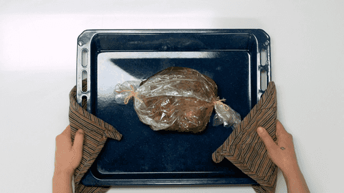 Разогреть духовку до 200 градусов. Размотать свинину и переложить в рукав для запекания, тщательно закрыть. Сделать несколько проколов. Запекать в разогретой духовке 15 минут.
