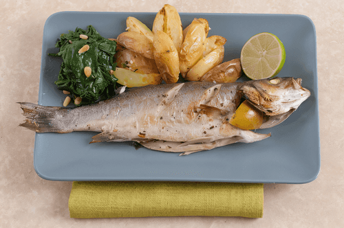 Сибас по-милански, запеченный с букетом ароматных трав, с картофелем и шпинатом