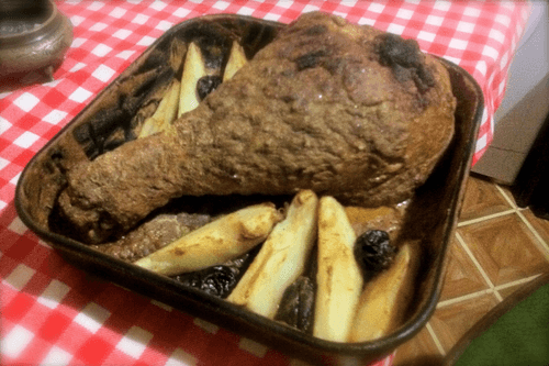Все! Вроде, я ничего не забыла, и мы смело можем отправлять блюдо в духовку на часа полтора. Не забываем ножку перевернуть за полчаса до окончания. Корочка хорошо пропитается и будет блестеть. Груши можно в это же время примять немного вилкой, чтобы они дали сок (его будет очень мало, но все же). Проверяем готовность, делая надрез в самой толстой части ножки.