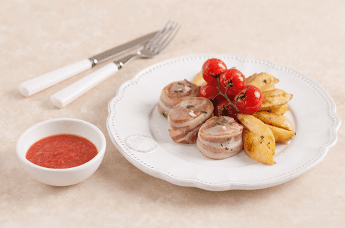 Турнедо из свинины с запеченным картофелем и томлеными в прованских травах томатами черри