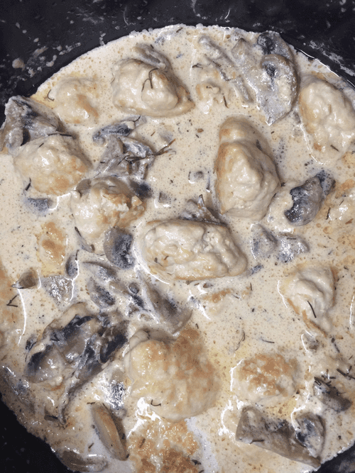 Готовим фрикадельки. В фарш мелко рубим чеснок (по вкусу). Солим, перчим по вкусу, разбиваем яйцо. Все тщательно перемешиваем. На сковороду выливаем 1 столовую ложку растительного масла, формируем из фарша шарики — фрикадельки диаметром не более 3 см, и выкладываем их на уже раскаленную сковороду. Обжариваем до корочки. Готовые фрикадельки складываем в сотейник, где у нас потихоньку кипят грибочки в сливках.