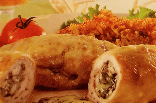 Куриное филе нарезать тонкими слоями и отбить тупой стороной ножа. На середину каждого кусочка филе уложить фарш, который состоит из части натертого сыра, мелко порубленного чеснока и зелени.