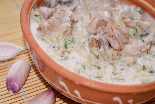 Мясо обжарить до легкой корочки. В молоке перемешать муку, чтобы не было комочков. Добавить к курице молоко, сметану, воду или бульон, соль, сахар, специи. Перемешать, тушить 5 минут. Затем добавить лук. Тушить до готовности, помешивая (под крышкой). В самом конце добавить давленный чеснок и мелко нарезанную зелень.