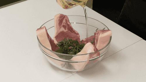 В масле с розмарином, укропом, можжевельником и лавром замариновать свинину, запечатать пленкой и оставить в холодильнике на восемь часов, чтобы мясо впитало ароматы. Пряности можно мелко нарубить, это эффективнее, но их придется смывать, прежде чем жарить мясо, чтобы они не горели.