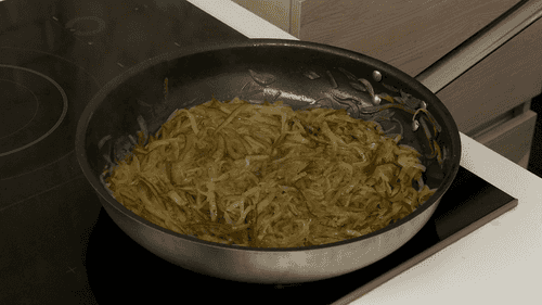 На том же масле, убавив огонь, слегка обжарить лук, добавить нарезанные соломкой огурцы, готовить две-три минуты, приправить перцем, а при желании сделать вкус гарнира более мягким — заправить сметаной.