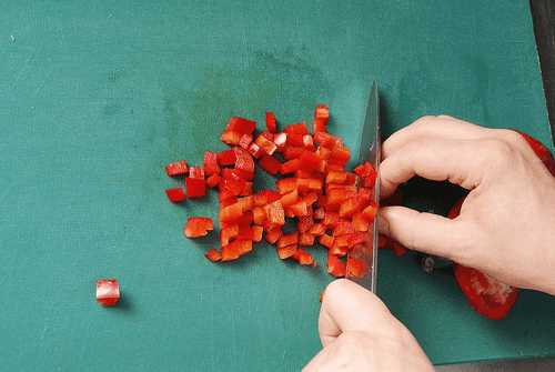 Примерно за полчаса до готовности хвостов очистить лук, морковь и перцы (для разнообразия палитры можно взять перцы разных цветов: один, например, красный, другой желтый), а затем нарезать их вместе с сельдереем одинаковыми кубиками среднего размера.