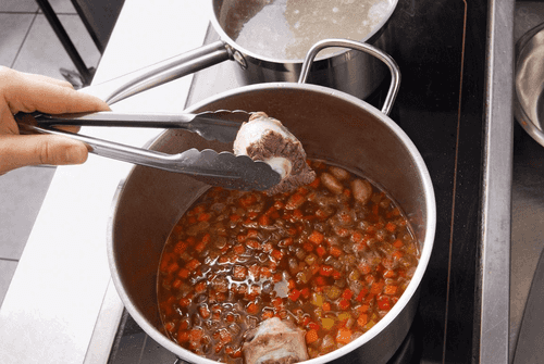 Выложить в соус хвостовые позвонки и тушить полчаса, чтобы они напитались соусом. Нужно следить за тем, чтобы не выпаривалось слишком много жидкости, и время от времени подливать воды. Когда мясо станет легко отделяться от костей, можно снимать с огня.