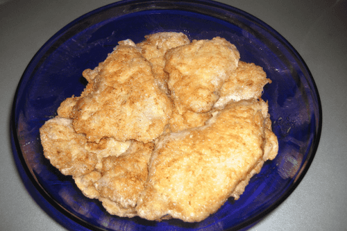 Каждый кусочек отбивной обвалять в манной крупе, затем в яйце и обжаривать на разогретой сковороде с двух сторон до золотистого цвета на среднем огне (по шкале электроплиты от 1 до 9 — на 6).