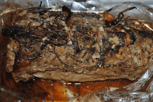 Натереть маринадом говядину. Положить в обычный пакет и со всех сторон окутать его веточками розмарина.