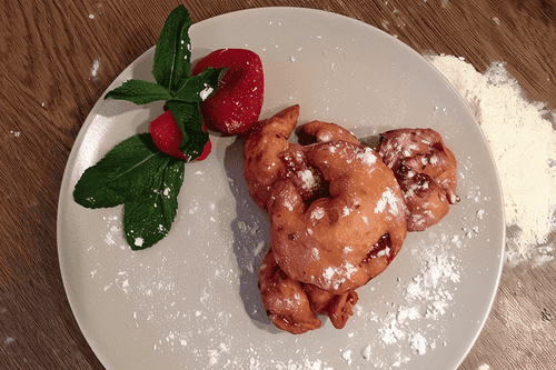 Оставшейся мукой присыпать доску или стол, выложить на нее тесто. Нарезать тесто небольшими кусочками, сделать из каждого кусочка лепешку. Положить в ее центр цукат или ягоды, защипнуть края и скатать в шарик (или иную форму, я делаю рожки или пельмени). Дать немного подняться и жарить во фритюре до готовности.