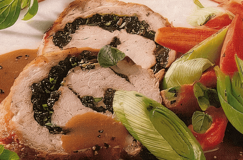 Рулетики из индейки со шпинатом и сыром в беконе — это изысканное блюдо русской кухни, сочетающее нежность индейки, насыщенный вкус сыра и пикантность бекона. Истоки этого рецепта уходят в традиции мясных закусок, где сочетание мяса с зеленью и сыром стало популярным. Шпинат добавляет свежесть, а бекон — хрустящую корочку и насыщенный аромат. Эти рулетики идеально подходят для праздничного ужина или семейного застолья, особенно в сочетании с легкими гарнирами. Блюдо получается сочным, с тонким балансом вкусов и аппетитным видом. Запекается оно до идеальной мягкости, сохраняя все соки. Подавать можно с соусами или свежими овощами, создавая яркое гастрономическое впечатление. Это не просто еда, а настоящее удовольствие, которое порадует гурманов.