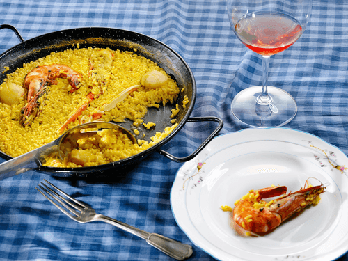 Убавить огонь, готовить паэлью минут пятнадцать, чтобы рис полностью впитал бульон. Посолить, если нужно, и подавать.