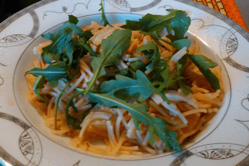 Готовое блюдо выкладываем в глубокие тарелки и украшаем свежей рукколой.