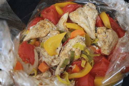 Закладываем овощи и грудку в пакет, завязываем и не забываем сделать отверстия. Ждем 30–40 минут. Достаем наше диетическое блюдо и аккуратно разрезаем пакет — только осторожно с горячим паром.