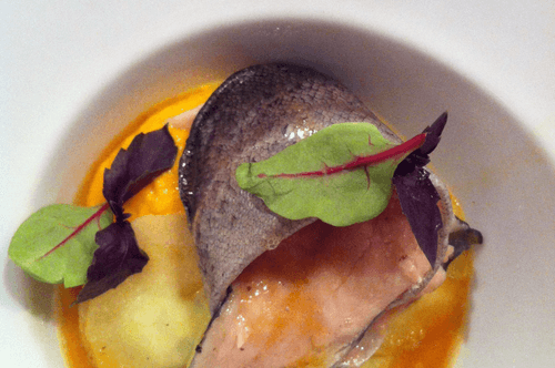 На тарелку выложить морковное пюре, в центр поместить филе форели и по кругу выложить яблочные равиоли.
