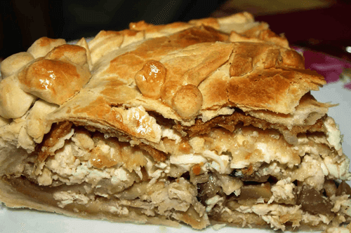 Курник из слоенного теста с блинами, грибами и курицей